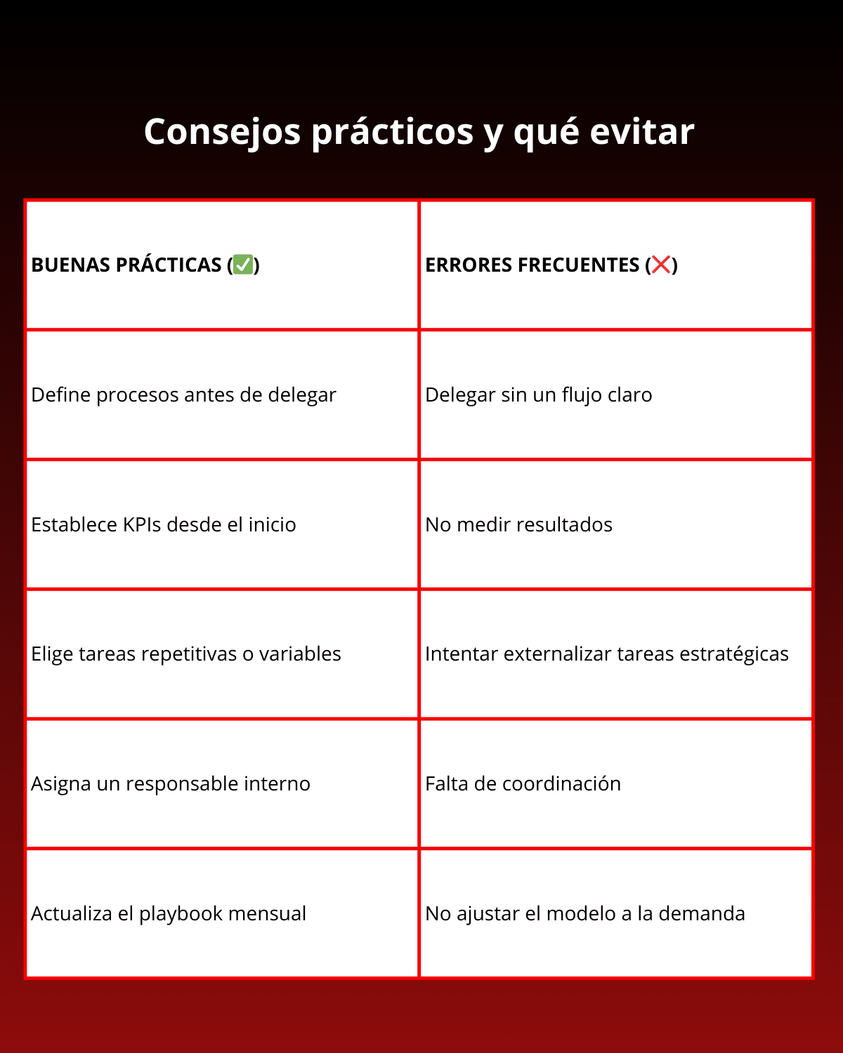 No diferenciar tareas estratégicas de operativas: saturar al equipo interno con gestiones repetitivas reduce foco y productividad.